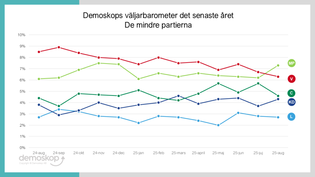 De två nya partiledarna tycks ännu inte ha lyckats göra någon större skillnad för C och L – varken åt det positiva eller negativa hållet. C tappar 1,1% och är nu tillbaka på sitt genomsnittliga stöd för det senaste året. Inte heller för Liberalerna tycks Mohamssons tillträdde ha påverkat väljarstödet, även de ligger exakt på sitt genomsnittliga väljarstöd för de senaste 12 månaderna.