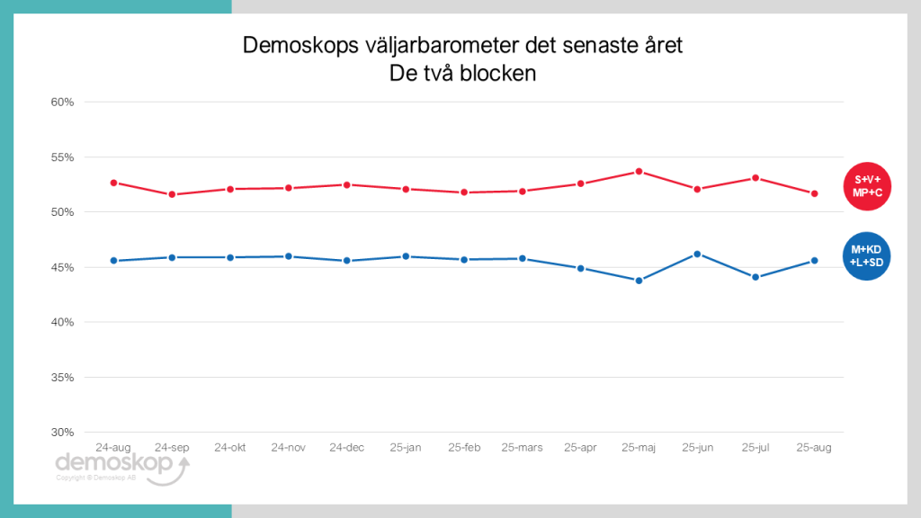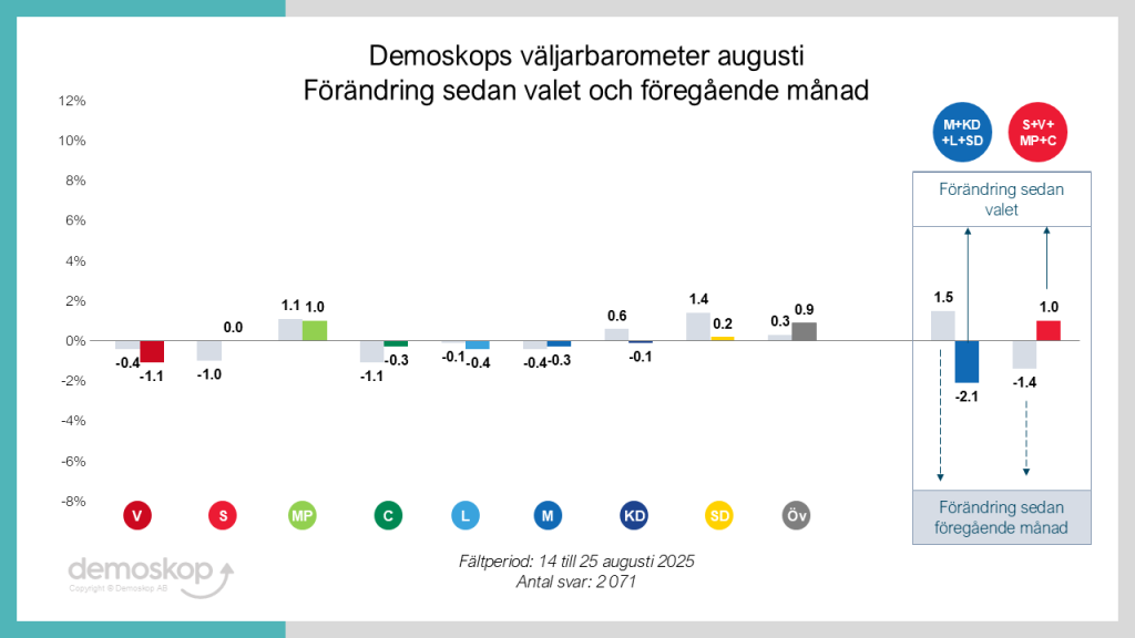 Blockskillnaden ligger i augusti på samma nivå som i juni – ungefär sex procentenheter. Vad gäller enskilda partiers förändringar är nästan alla mycket små sedan förra månaden. Inom vänsterblocket ser vi en viss nedgång för S och en samtidig uppgång för MP. Samtidigt ökar även SD något med 1,4%, vilket är den största enskilda förändringen denna månad.