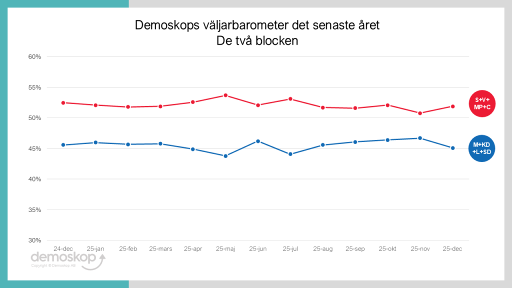 Den största enskilda förändringen denna månad är att Moderaterna backar 1,4 procentenheter och därmed får sitt lägsta väljarstöd i Demoskops väljarbarometer på över fem år, sedan maj 2019. Dessutom kvarstår regeringens problem med att Liberalerna ligger under riksdagsspärren och nu i december tangerar sin lägsta siffra någonsin i Demoskops mätningar. De stöds nu endast av 2% av väljarkåren. De har dock varit nere på samma låga nivå vid ett par tidigare tillfällen de senaste åren.
