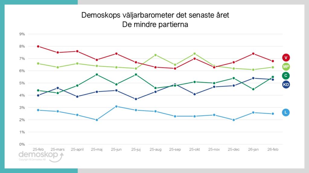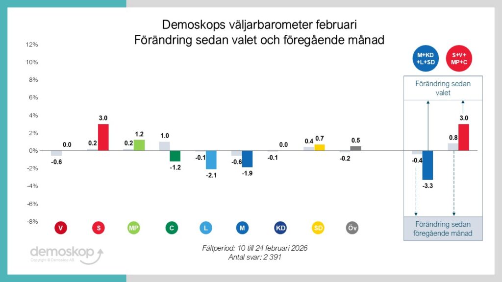 I februarimätningen har både KD och C en någorlunda betryggande marginal till riksdagsspärren, medan L ligger kvar på ungefär samma nivå som förra månaden: 2,5%. Liberalerna är därmed återigen det parti som har tappat flest väljare sedan valet 2022 strax före Moderaterna, och S är det parti som har vunnit flest väljare. Blockskillnaden ökar åter något och ligger nu på 5,7 procentenheter till oppositionens fördel.