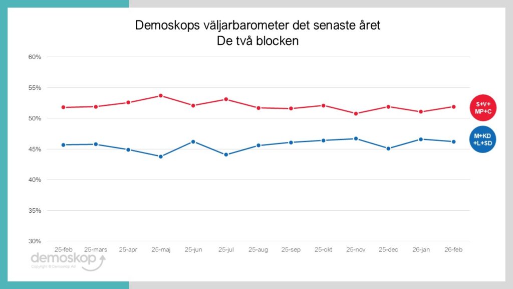 - Blockdifferensen ökar återigen något till 5,7 procentenheter.
